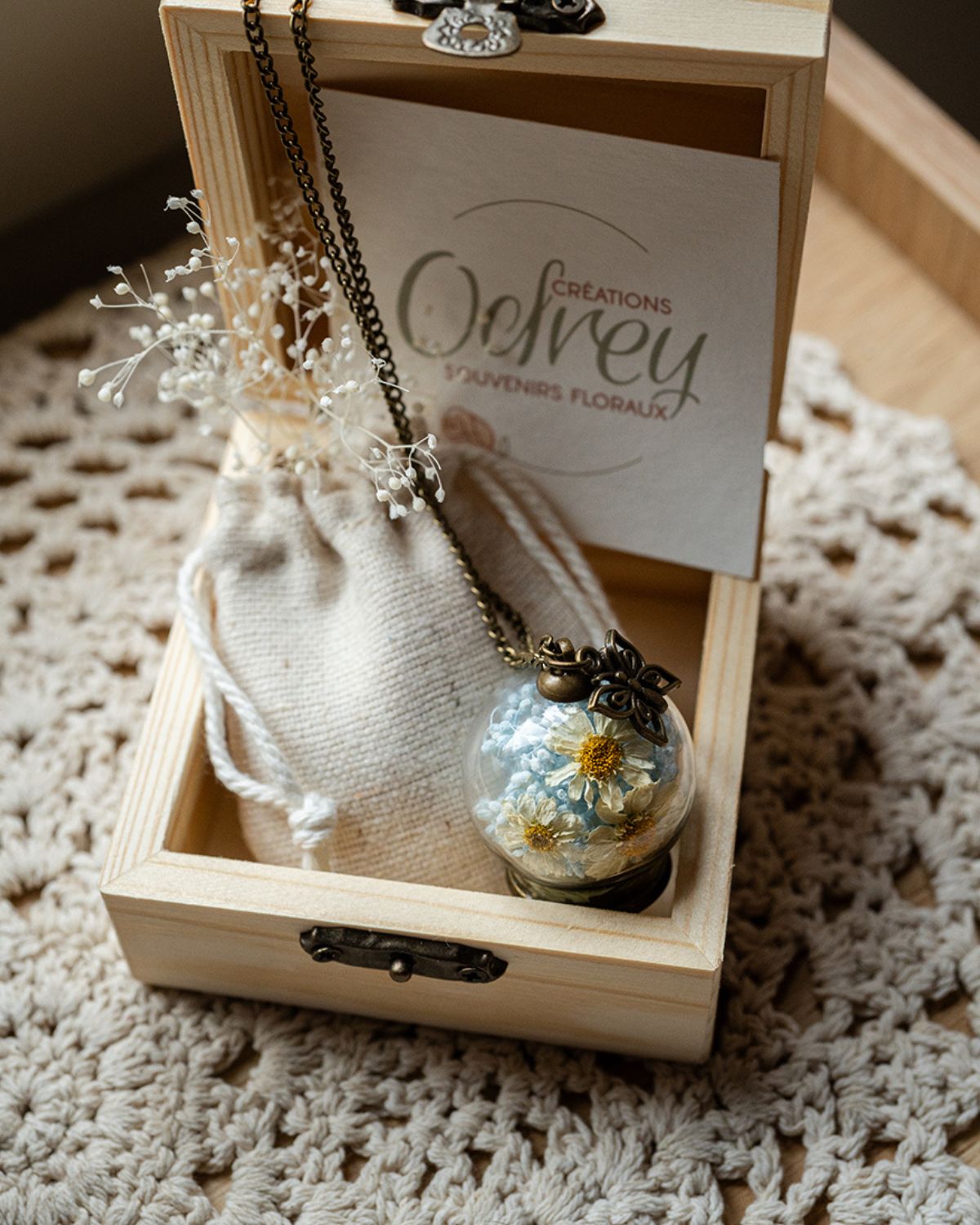 À travers mes pendentifs et arrangements floraux, je souhaite vous faire découvrir le langage des fleurs et vous accompagner dans la création d’un souvenir porteur de sens et de douceur.