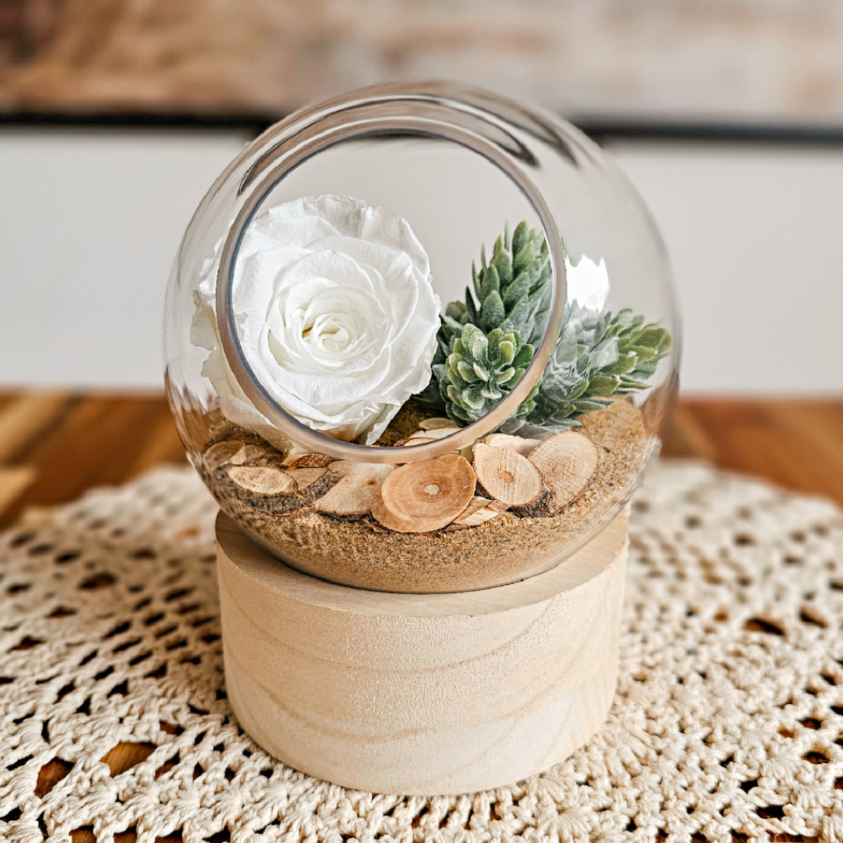 Vase boule base bois 5½’’x 7’’, parfait pour accueillir une seule rose éternelle avec une petite plaquette et une bouteille messagère.