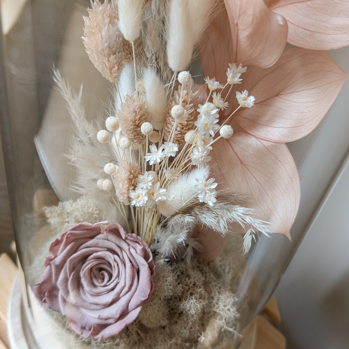 Chaque arrangement floral personnalisé avec rose éternelle est une création porteuse de sens et remplie de douceur, réalisée à la main ici au Québec pour honorer, remercier ou garder près de soi un moment ou une personne précieuse.