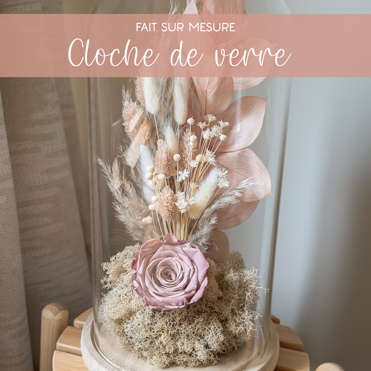 Vase cloche de verre avec base en bois 6’’x 12½’’ , parfait pour accueillir 1 à 3 rose éternelle.