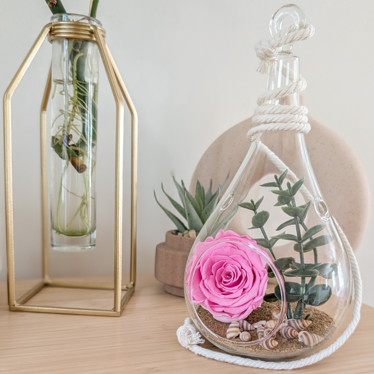 Vase petite goutte suspendue 4’’x 8’’, parfait pour accueillir une seule rose éternelle et une bouteille messagère.