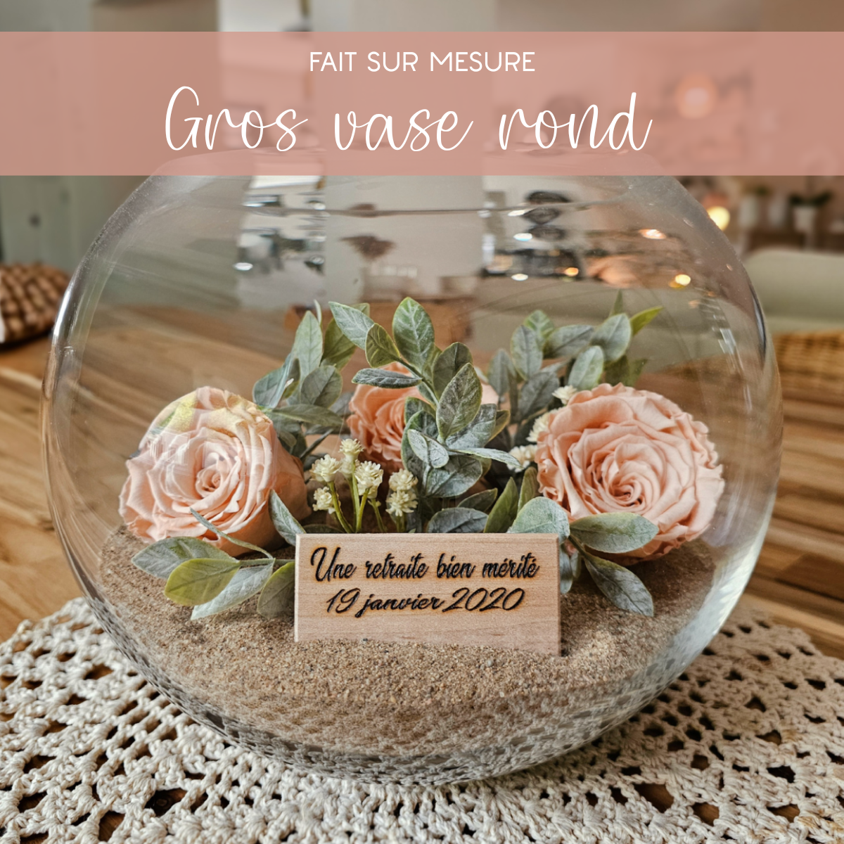 Vase gros rond 10’’, parfait pour accueillir 1 à 5 roses éternelles avec une plaquette de bois et bouteille messagère.