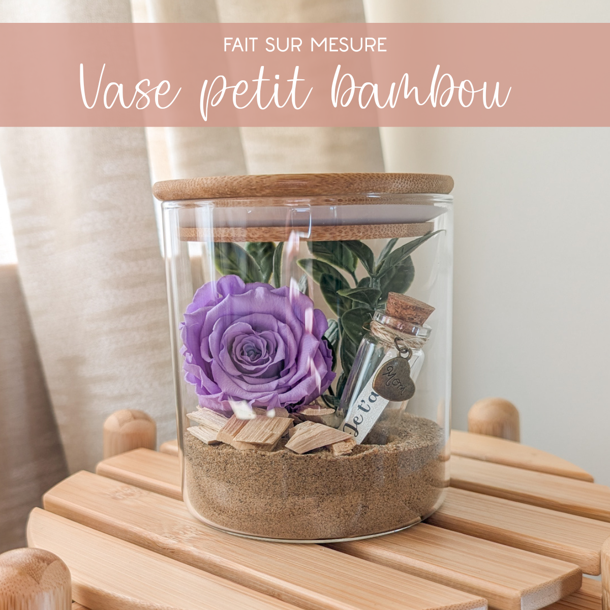 Vase petit bambou (4’’ x 4 ½’’), idéale pour inclure une rose éternelle et une bouteille messagère.