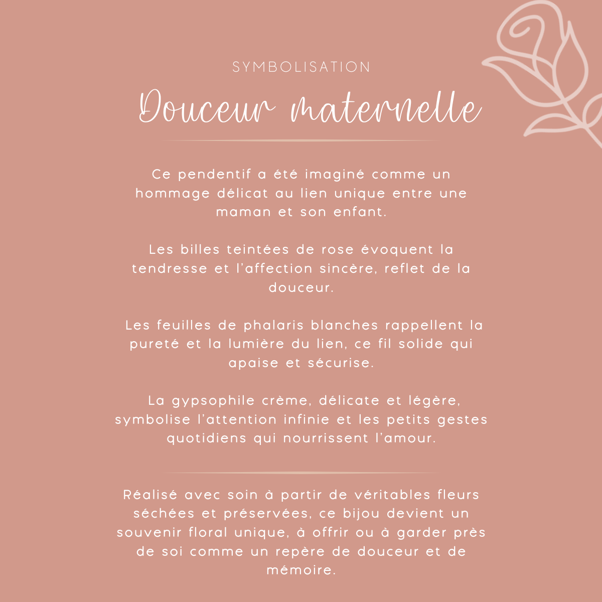 Confectionné à la main ici, au Québec, avec de véritables fleurs séchées et préservées, chaque pendentif floral devient un souvenir unique, empreint de douceur, de gratitude et d’émotion — parfait pour souligner une naissance, honorer le lien maman-enfant ou offrir un cadeau symbolique rempli de sens.