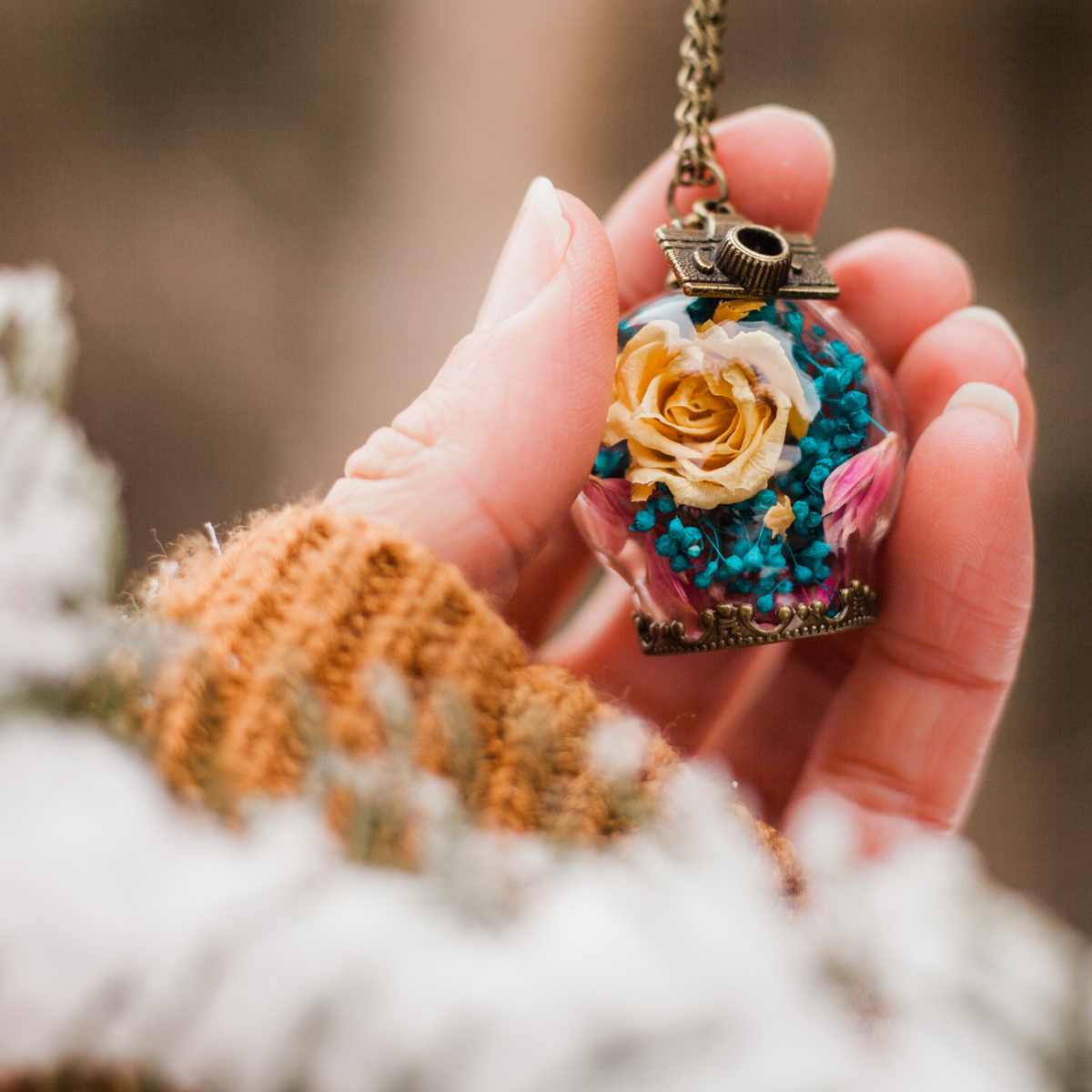 Évite tout contact avec l’eau afin de préserver la qualité du pendentif ainsi que la beauté des fleurs.